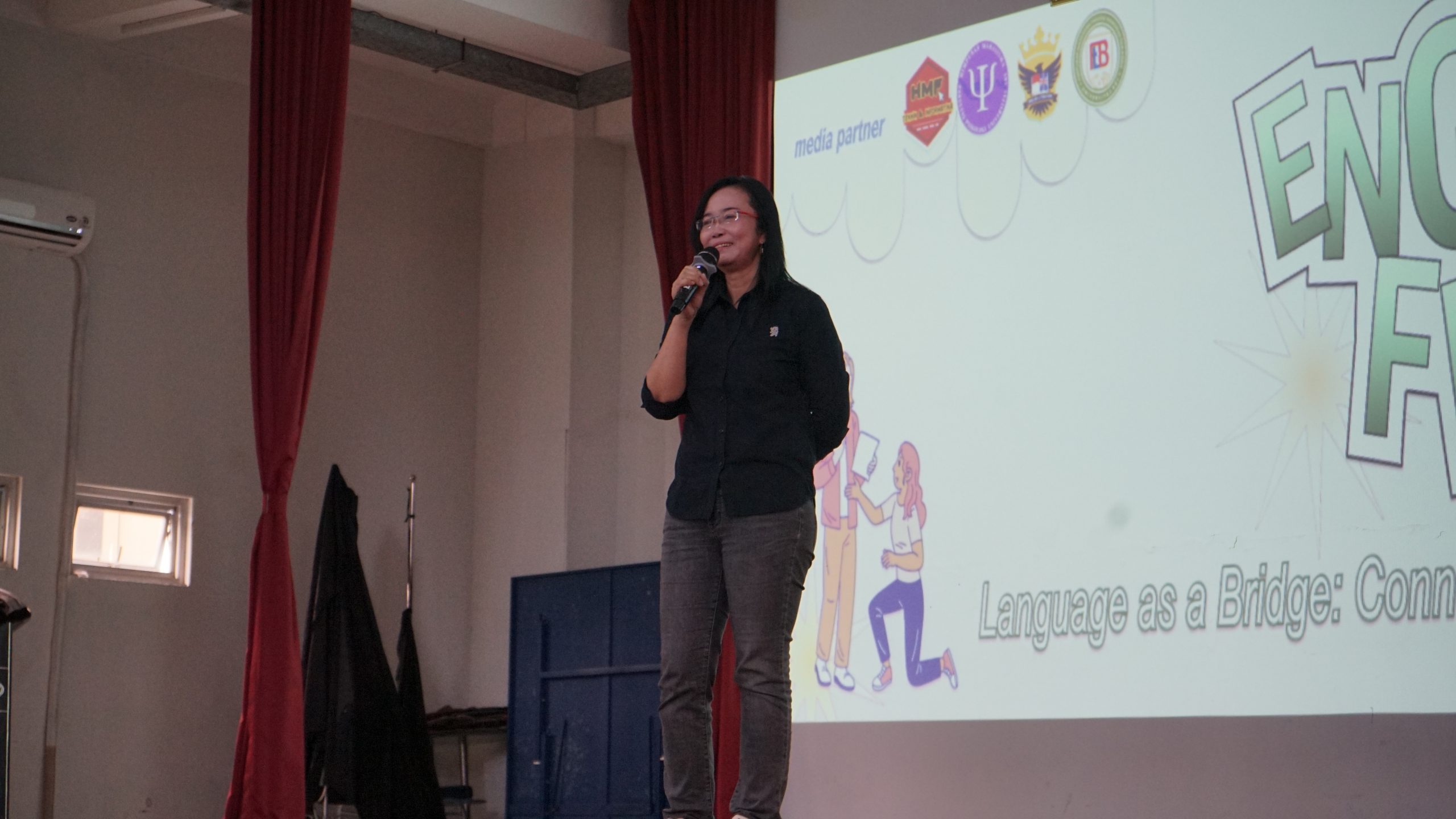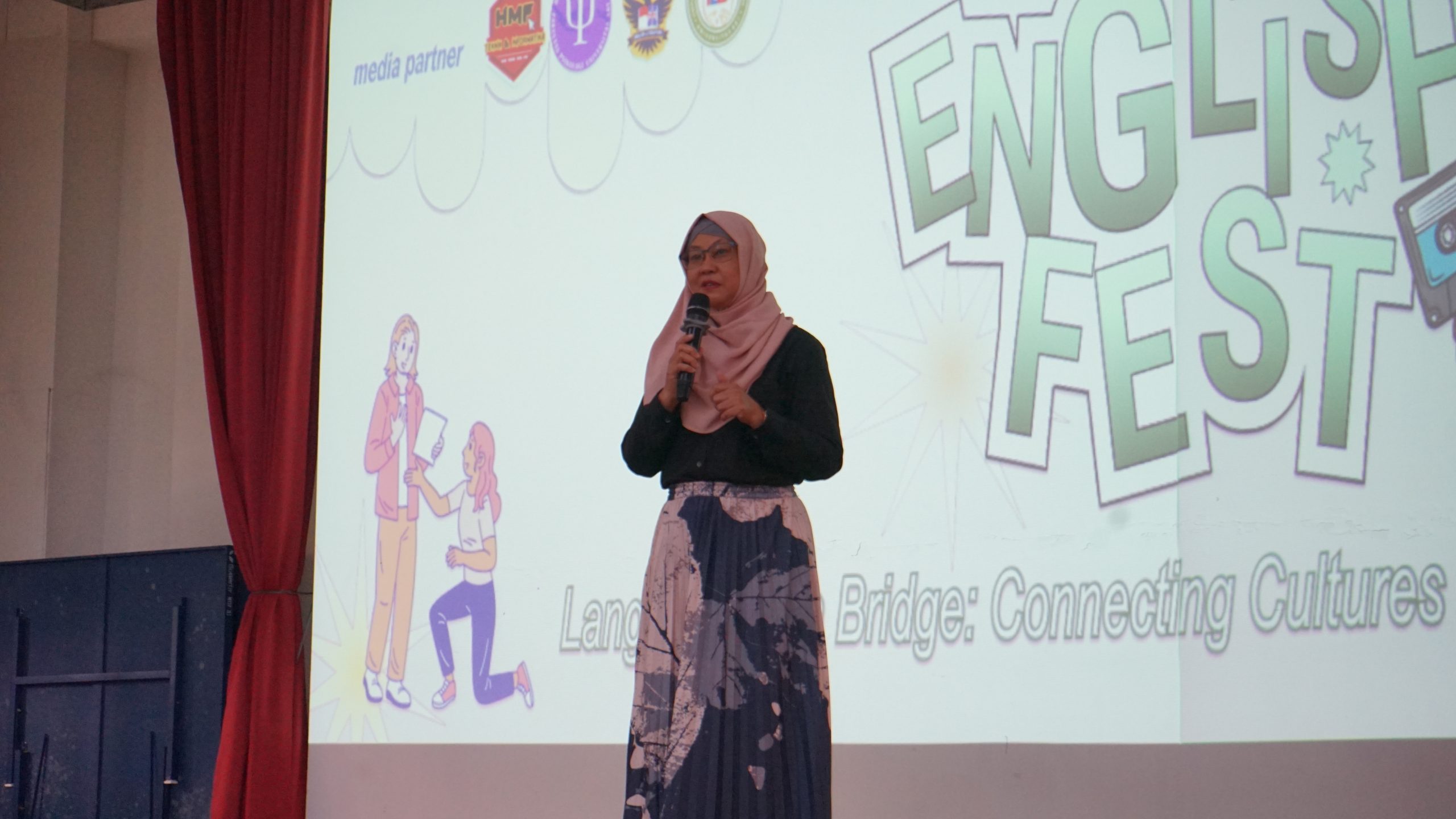 Sambutan dilanjutkan oleh Indah Arvianti, S.S., M.Hum., Dekan Fakultas Bahasa dan Budaya, yang menekankan pentingnya English Fest sebagai wadah untuk mengekspresikan kemampuan berbahasa Inggris secara kreatif. “English Fest bukan sekadar acara hiburan, tetapi juga merupakan laboratorium hidup di mana mahasiswa dapat mempraktikkan kemampuan bahasa Inggris mereka dalam konteks yang menyenangkan dan tidak formal,” jelasnya dengan antusias. Dekan Indah juga mengapresiasi kerja keras seluruh panitia yang telah mempersiapkan acara ini dengan sangat baik, serta berharap English Fest dapat menjadi momentum untuk terus meningkatkan kualitas pembelajaran bahasa Inggris di FBB UNAKI.