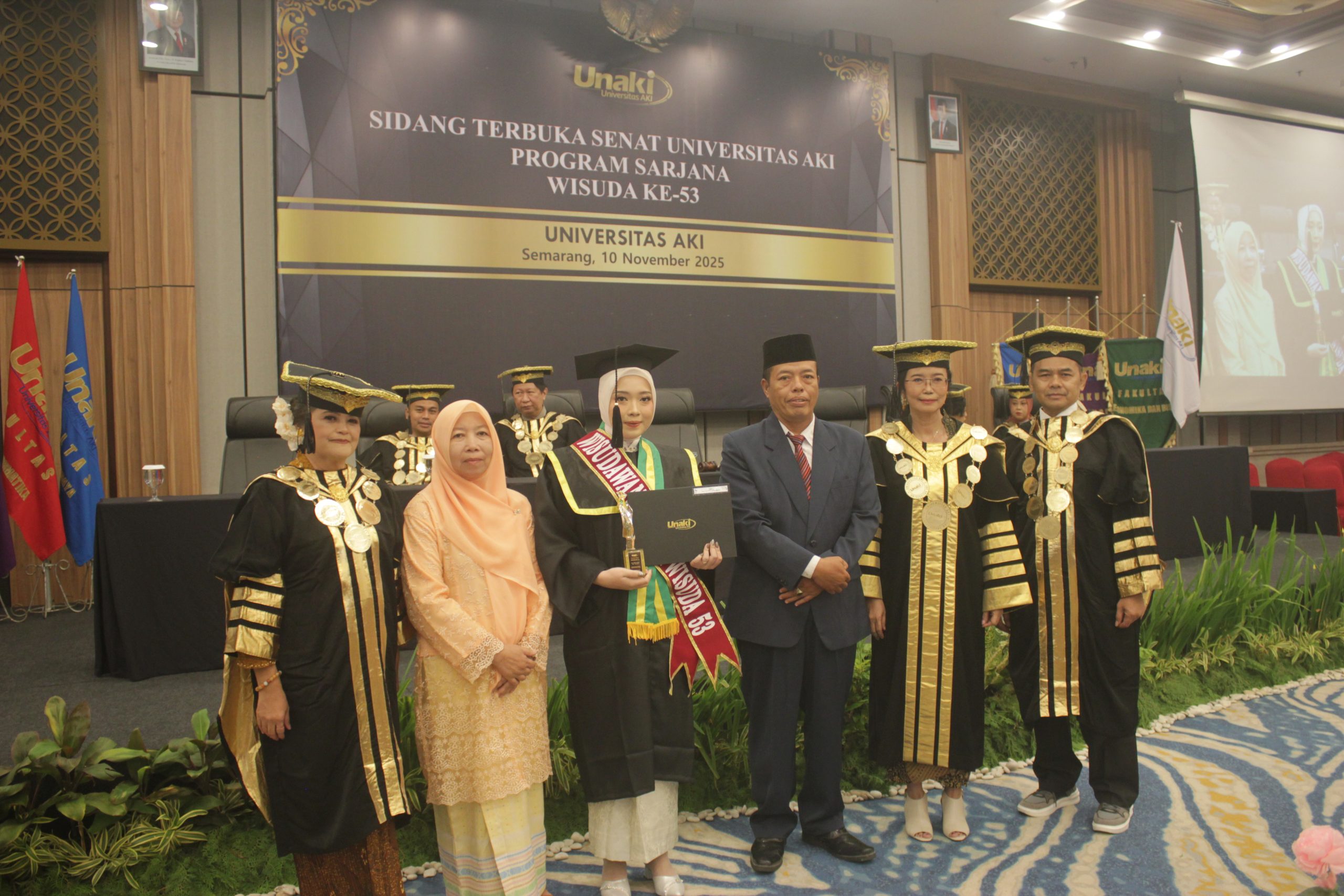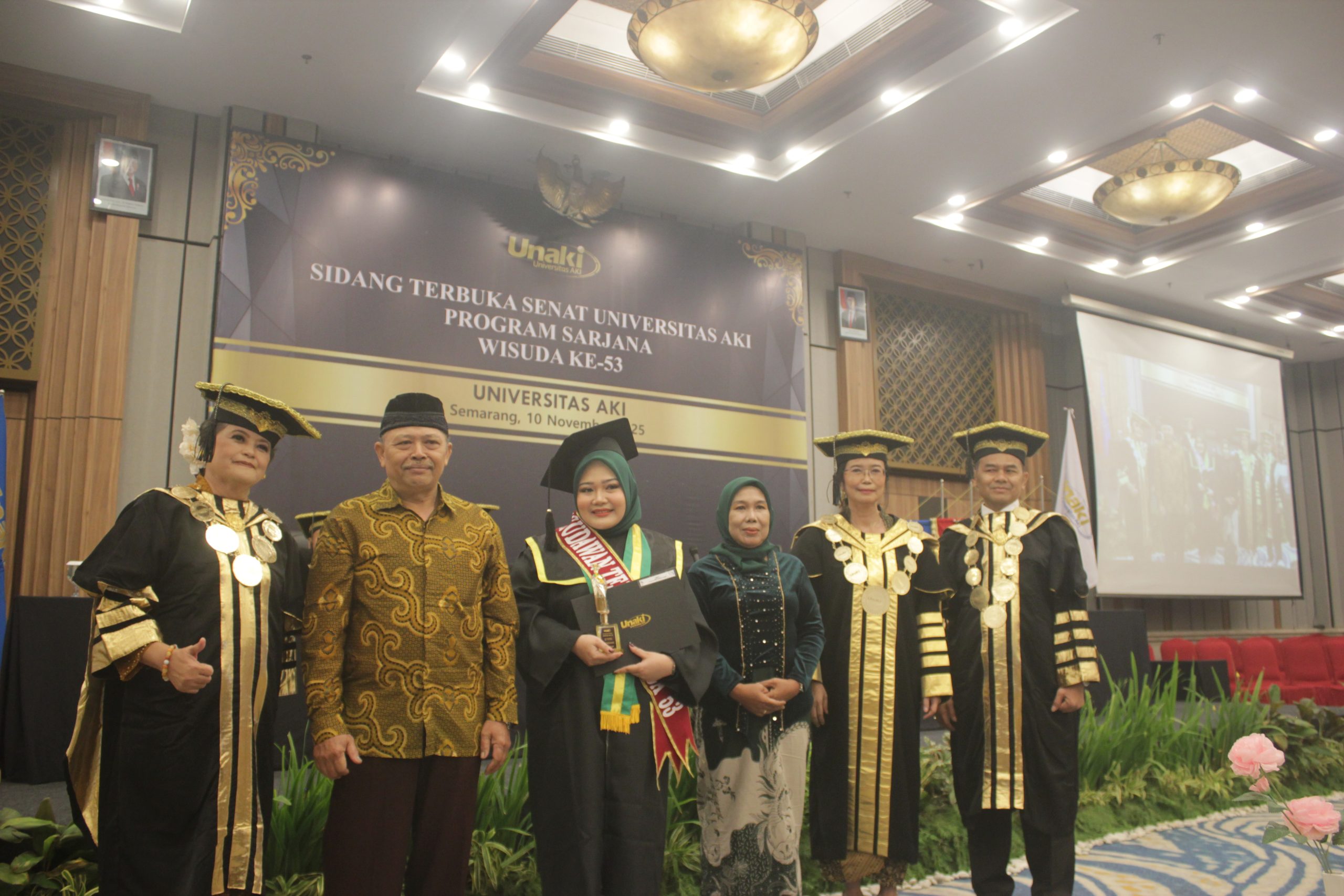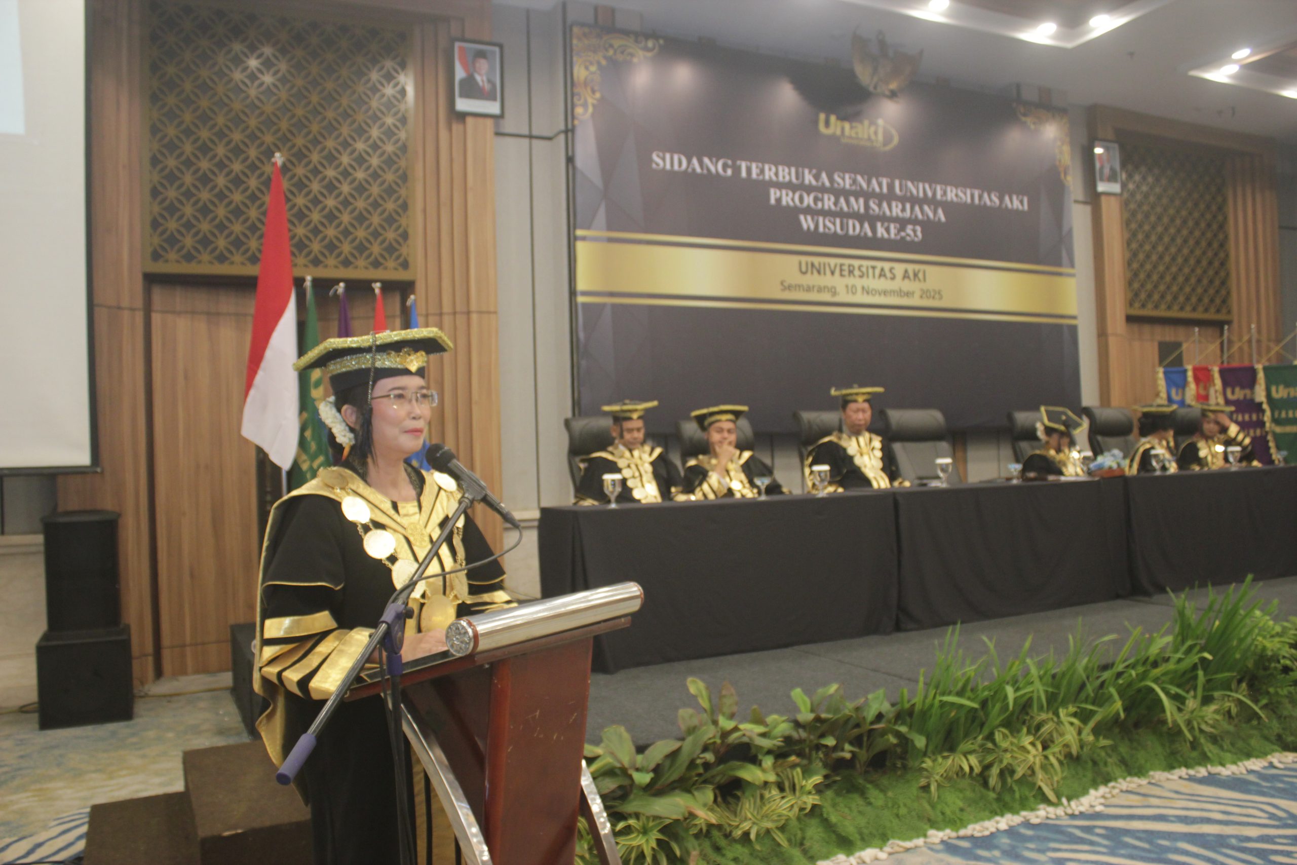 SEMARANG – Bertepatan dengan Hari Pahlawan 10 November 2025, Universitas AKI melaksanakan Sidang Terbuka Senat untuk Wisuda Sarjana ke-53 di Rama Shinta Ballroom Patra Semarang Hotel & Convention. Dalam kesempatan tersebut, Rektor Universitas AKI Prof. Dr. Tri Purwani, S.E., M.M. menyampaikan selamat kepada seluruh wisudawan dan wisudawati, sekaligus memberikan apresiasi tinggi kepada para orang tua atas kepercayaan dan kerjasama yang telah terjalin.