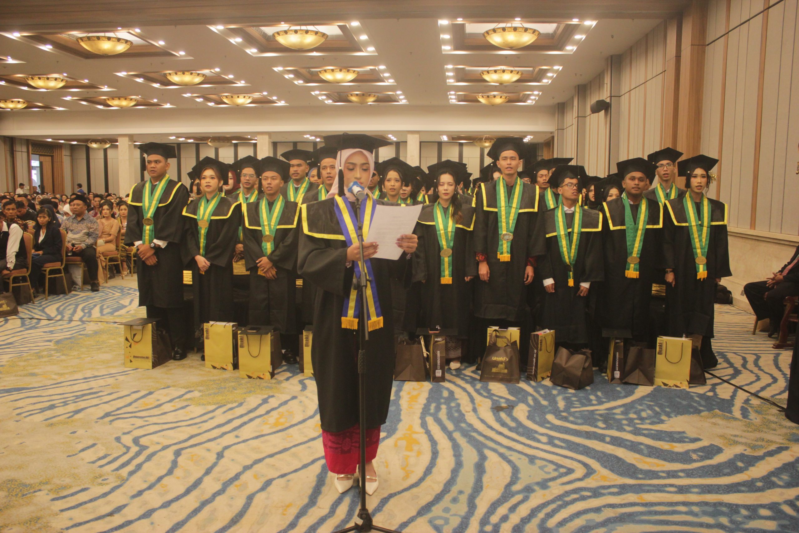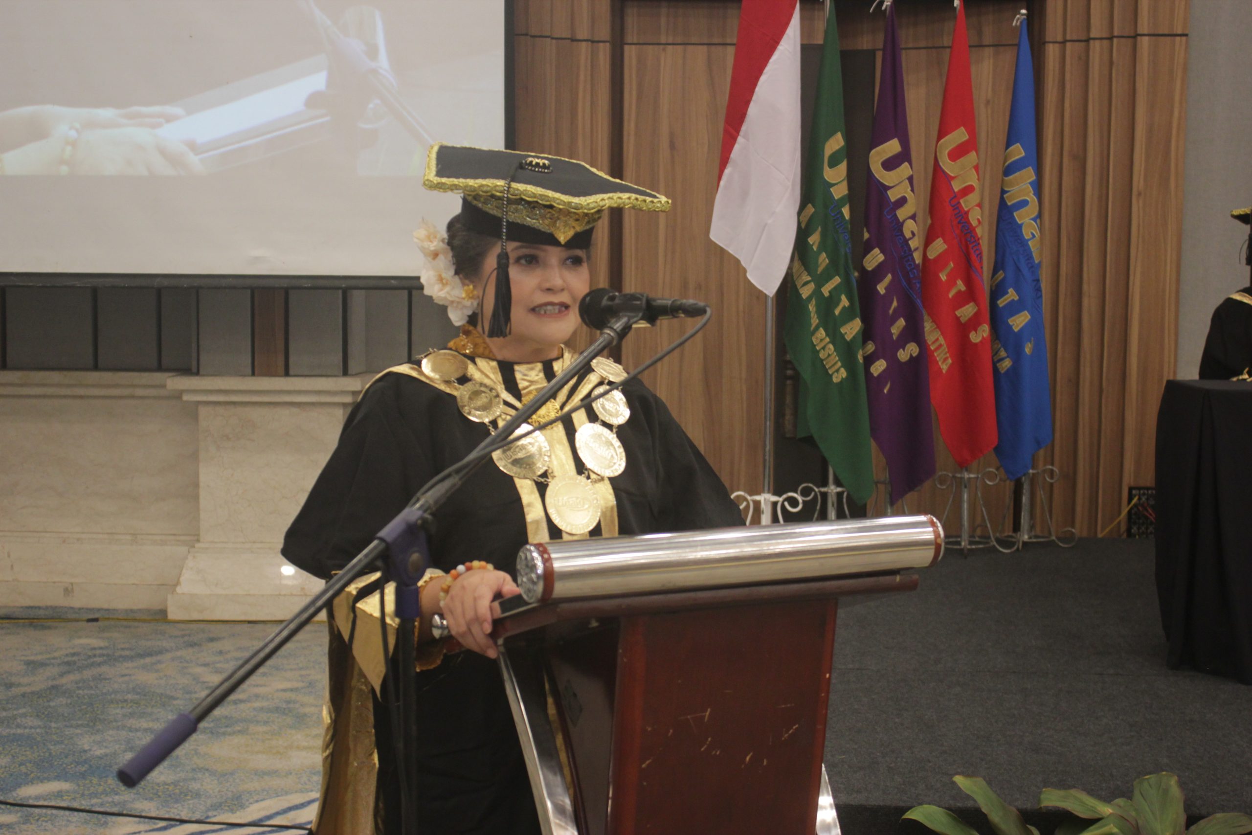 Rektor menutup sambutannya dengan sebuah kiasan inspiratif menggunakan kisah Burung Rajawali. “Teruslah belajar, teruslah tumbuh, dan terbanglah setinggi langit, namun dengan kerendahan hati di bumi,” pungkasnya.